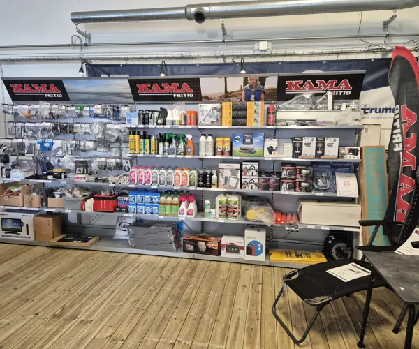 I våra mindre men välsorterade tillbehörsbutik hittar du allt du behöver till din husvagn eller husbil. Kanske behöver du solstolar, en grill, en ny kylbox, markiser eller kem till toaletterna. Hos oss kan du i lugn och ro välja det du behöver för att göra semestern till precis det du önskar. Vår kunniga personal hjälper dig att hitta rätt tillbehör till just din husvagn eller husbil.